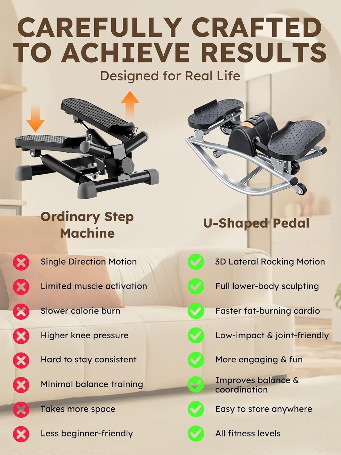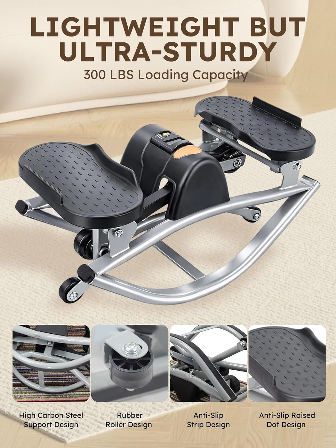 Side-to-Side Rocking Motion: The lateral rocking design activates glutes, thighs, hips, and core more effectively than traditional up-and-down steppers, delivering deeper lower-body engagement and balanced muscle toning through a natural skiing-style movement