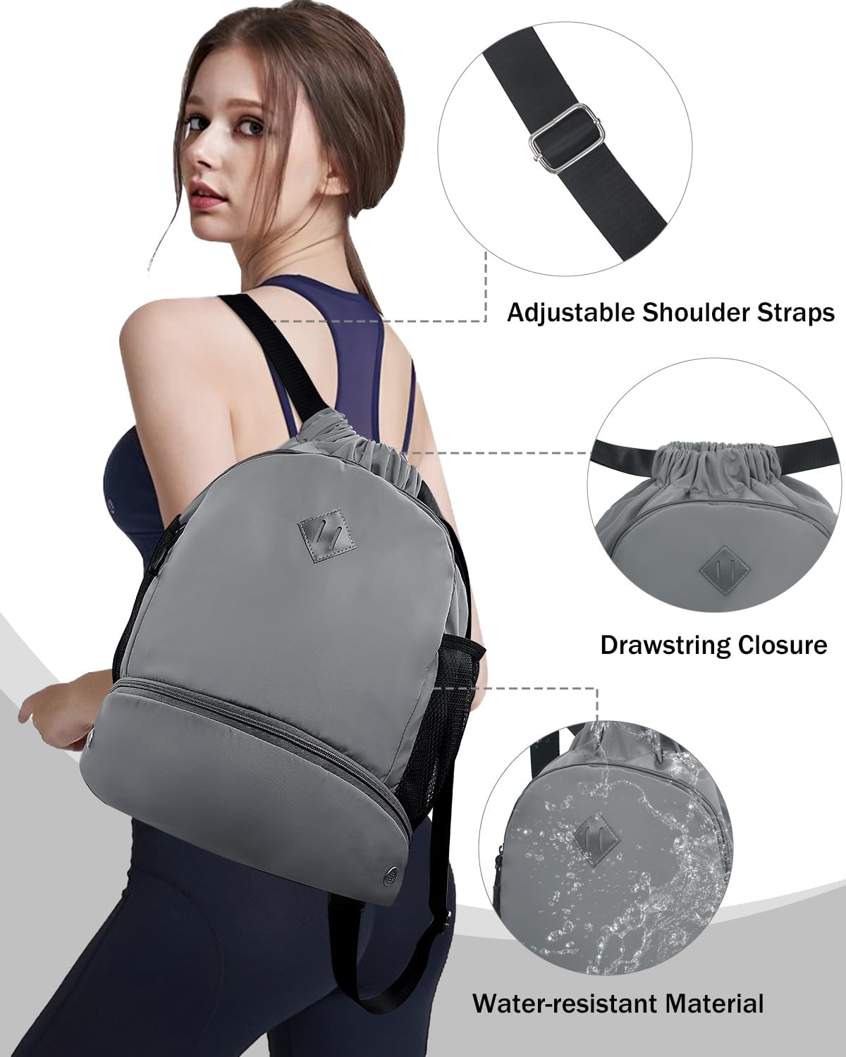 13 reviews for Drawstring Backpack Gym Backpack with Shoe Compartment for Men Women String Sports Bag with Wet Pocket Cinch Swim Beach Bag, Gray (Patent Pending)