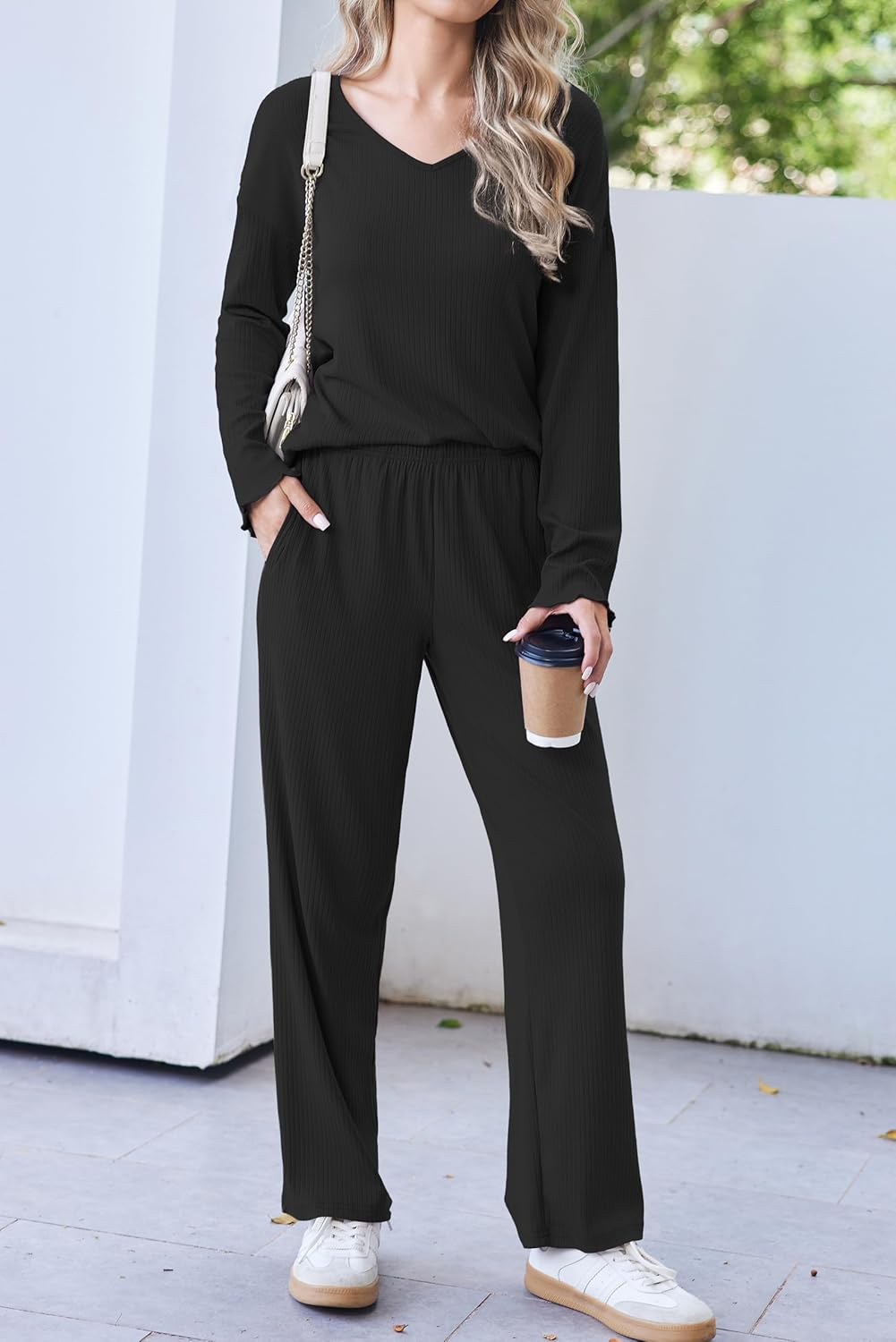 Ekouaer Ribbed Knit Pajama Set for Women Long Sleeve Sleepwear V neck PJs
