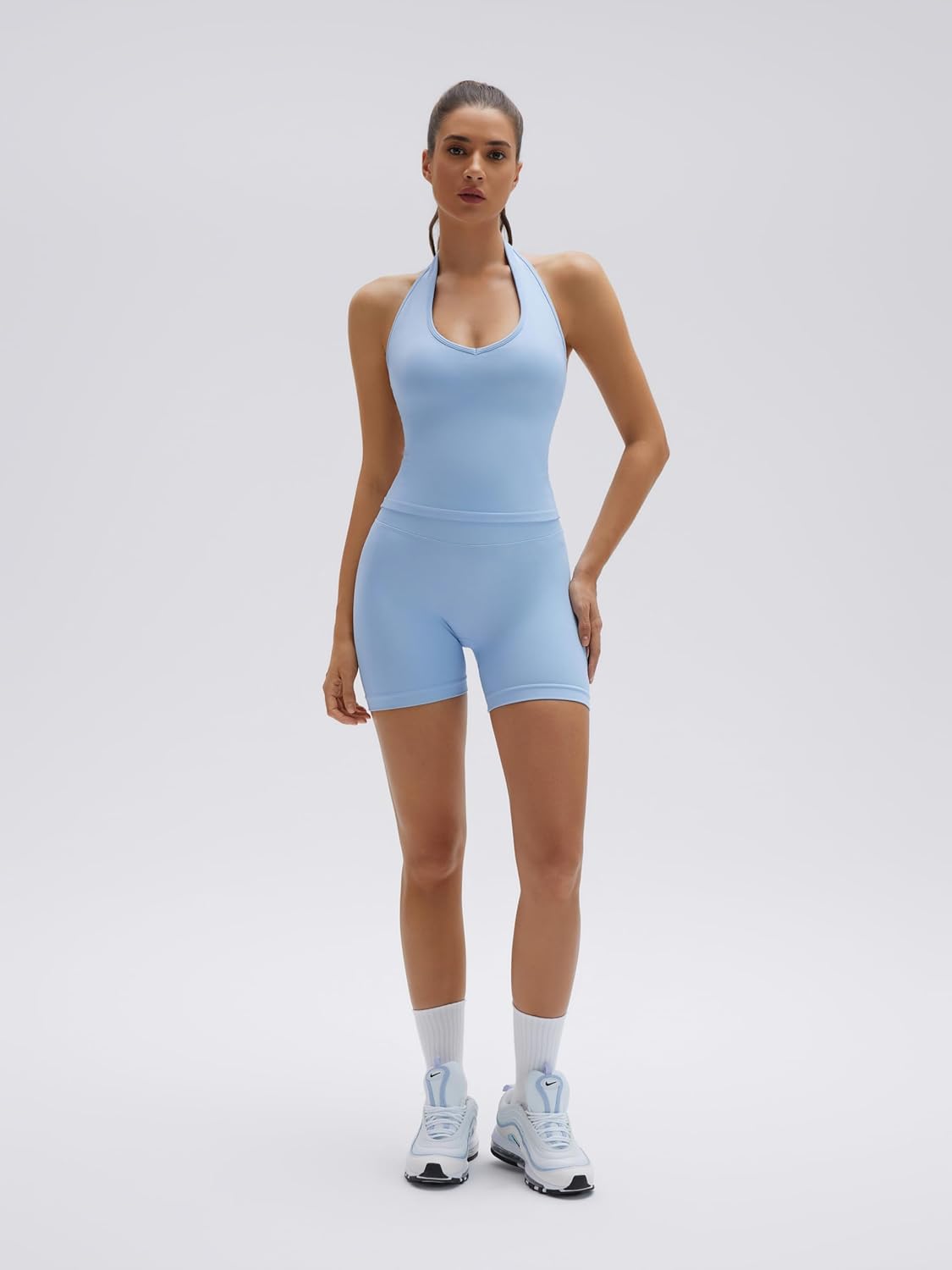 I normally wear a size 2X, but this fits okay, just a little snug…So, I would definitely recommend getting your regular size and then it’ll be on point!!!I’ve lost 100 pounds so I’ll still be able to wear this set comfortably!!!I love it and highly recommend it!!!Very well made and super soft too!!!Womens 2 Piece Workout Sets Padded Halter Tank Top Gym Sets Seamless Tummy Control Biker Shorts for Athletic