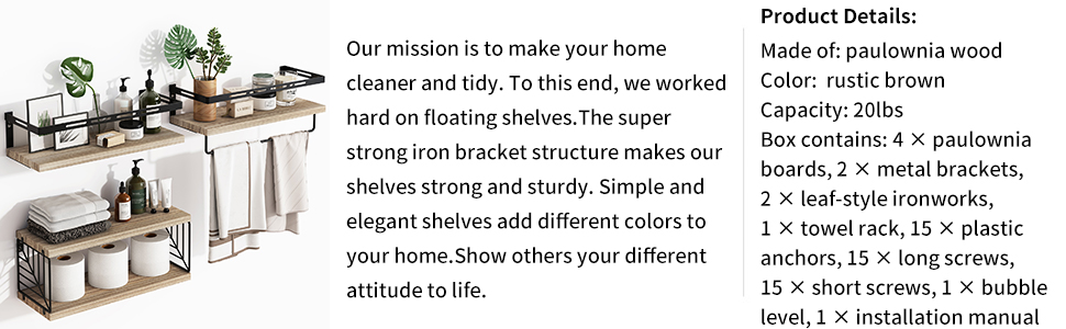 [Product Specification]- Each shelf measures 15.8 x 5.9 x 0.6 inches. The package includes 4 paulownia boards, 2 metal brackets, 2 leaf-style ironworks, 15 plastic anchors, 15 long screws, 15 short screws, 1 towel rack, and 1 installation manual. When firmly installed on the wall, these shelves have a weight capacity of up to 20 lbs.